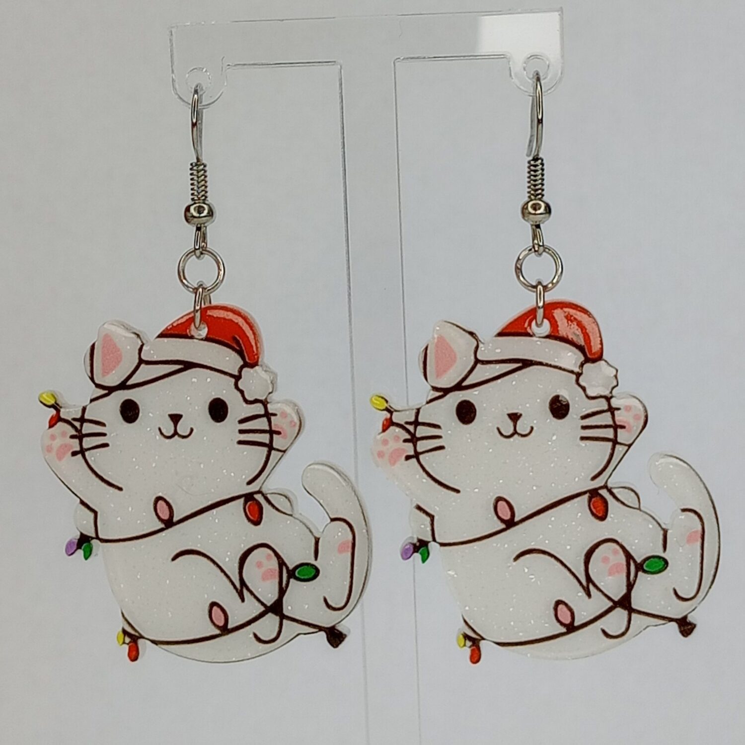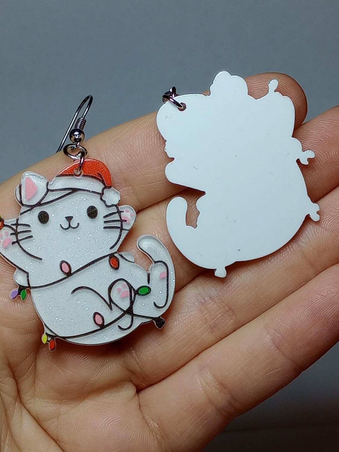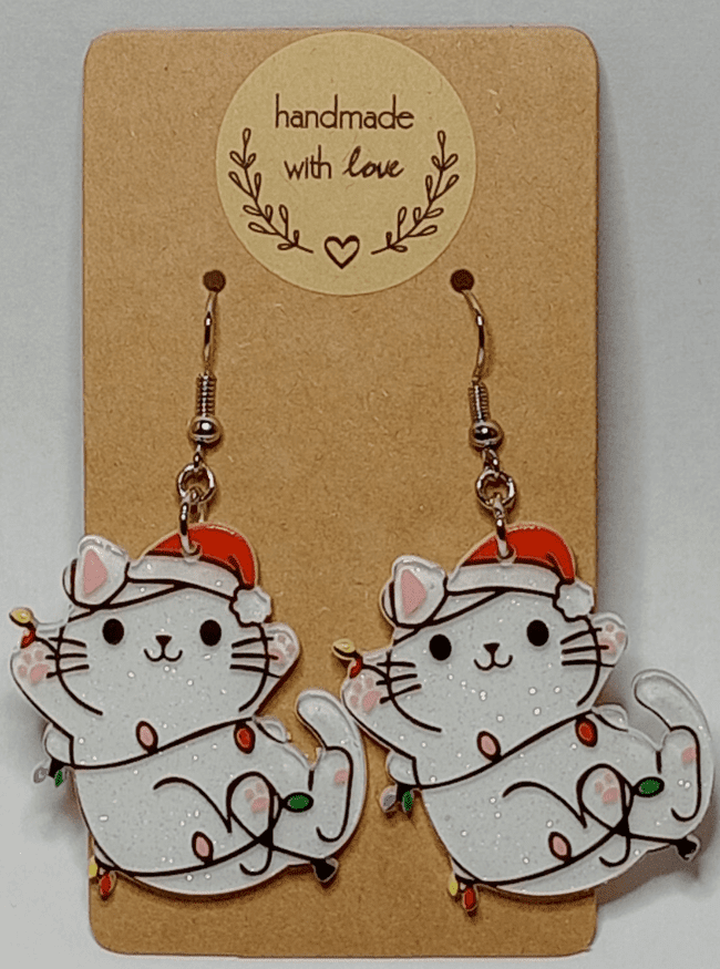 Cute, festive, and full of playful charm, these Cat In Christmas Lights Earrings are a fun choice for anyone looking for cute cat earrings with a bright holiday twist. Each earring features a white cat design wearing a Santa hat and wrapped in colorful Christmas lights, giving the pair a cheerful, lighthearted look. These dangling Christmas cat earrings feel light and easy to wear, whether you’re styling them with cozy winter outfits, holiday party looks, or just adding a little extra seasonal fun to your day. They’re especially lovely for cat lovers who enjoy festive jewelry that feels whimsical, merry, and just a bit cheeky. A sweet little pair that looks very pleased with its decorating skills.