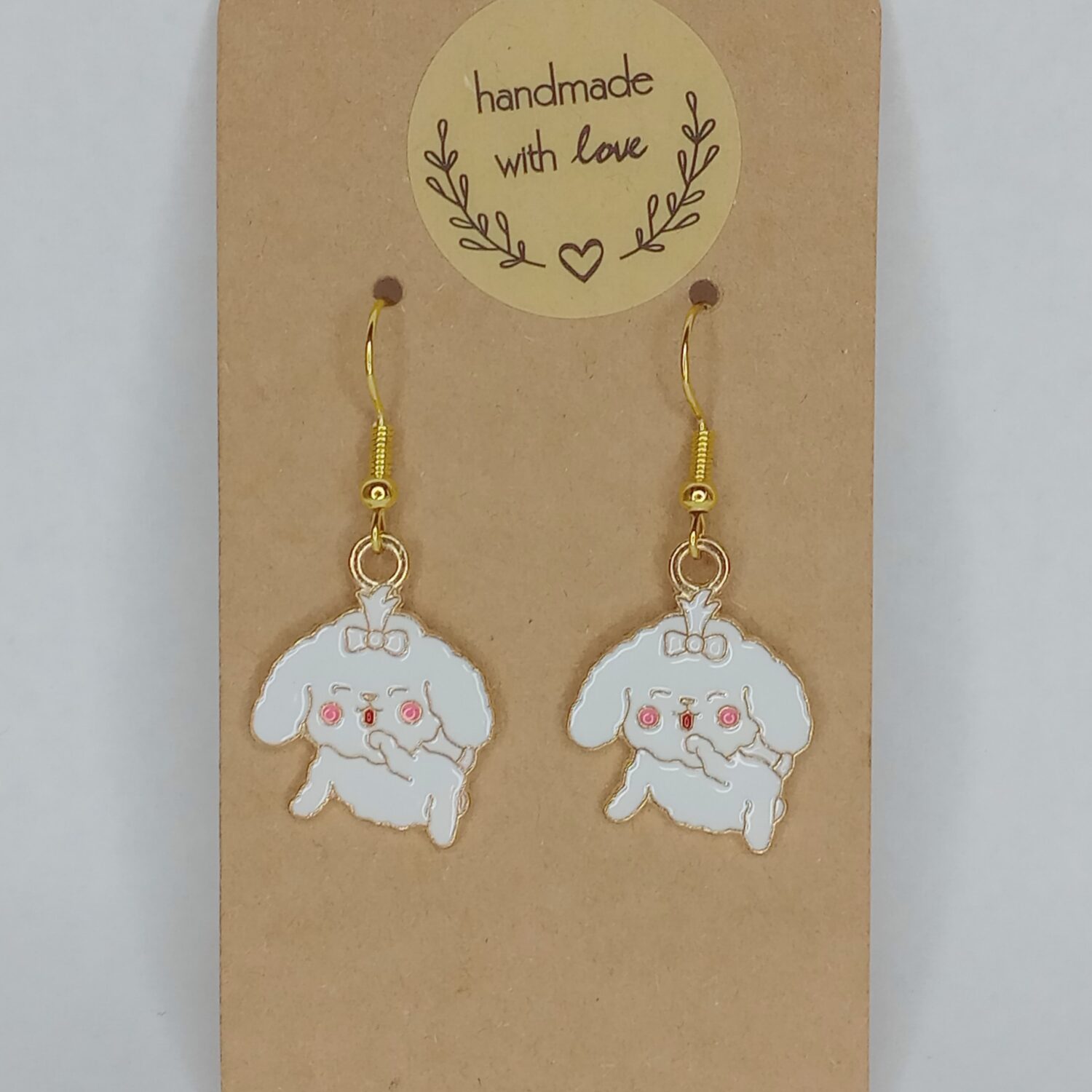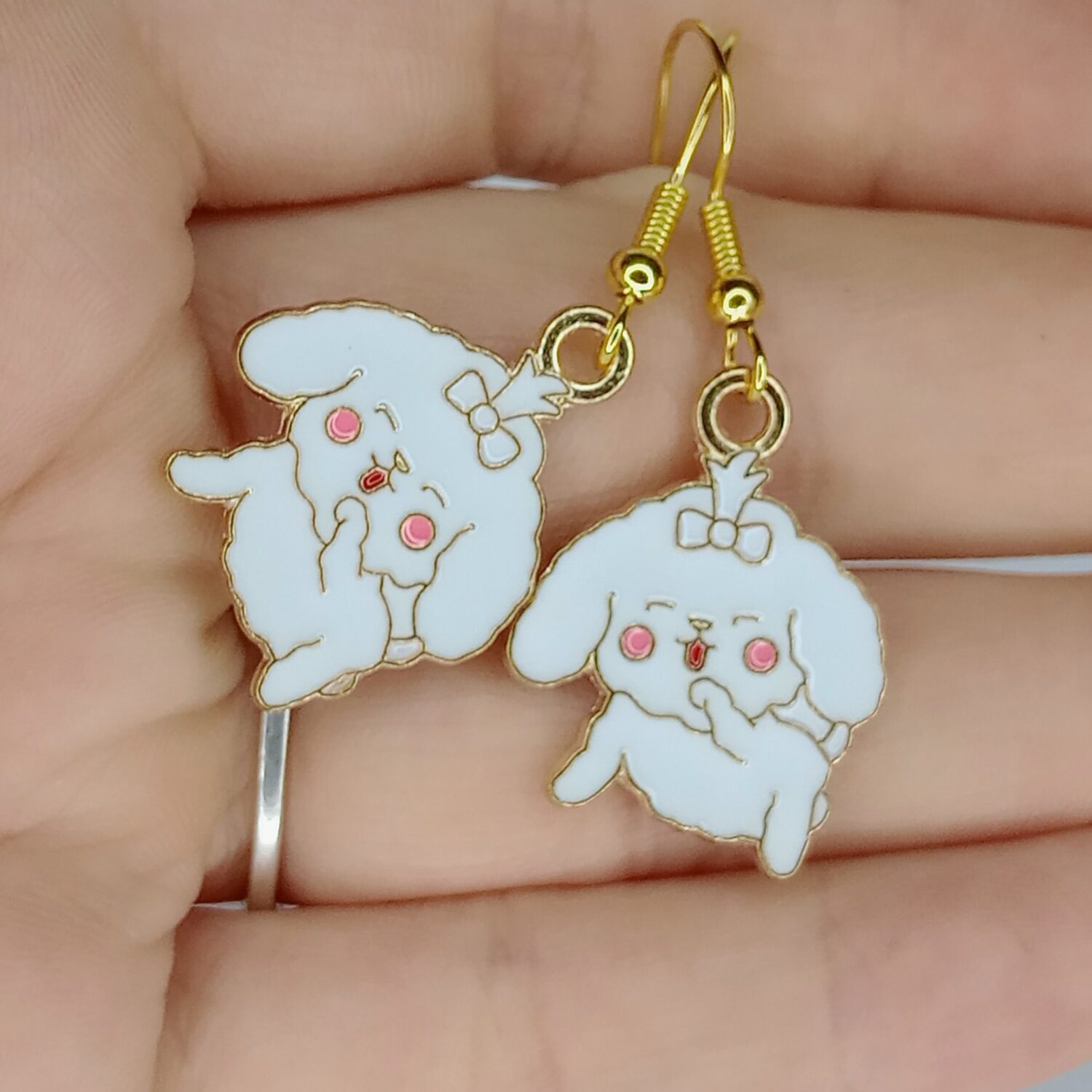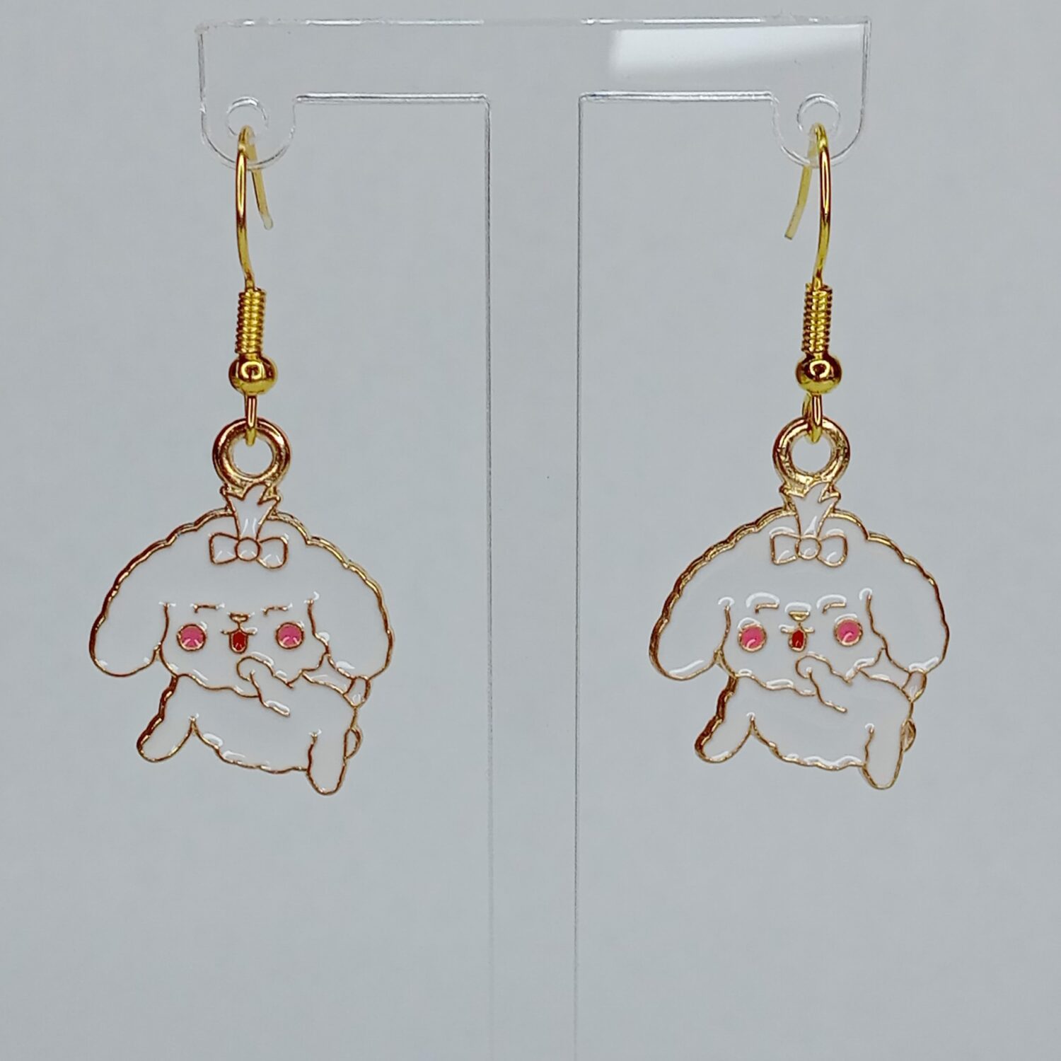 Soft, sweet, and full of lovable charm, these Sweet Pup Charm Earrings are the kind of pair that instantly makes a look feel a little more cheerful. Each earring features a fluffy white pup design with tiny pink cheeks and a polished gold tone outline that keeps the whole piece feeling bright and delicate. They’re light and easy to wear, whether you’re pairing them with casual outfits or just adding a cute little detail to your day. They’re especially lovely for dog lovers who like their accessories playful, gentle, and full of personality. A darling little pair that is almost impossible not to adore.