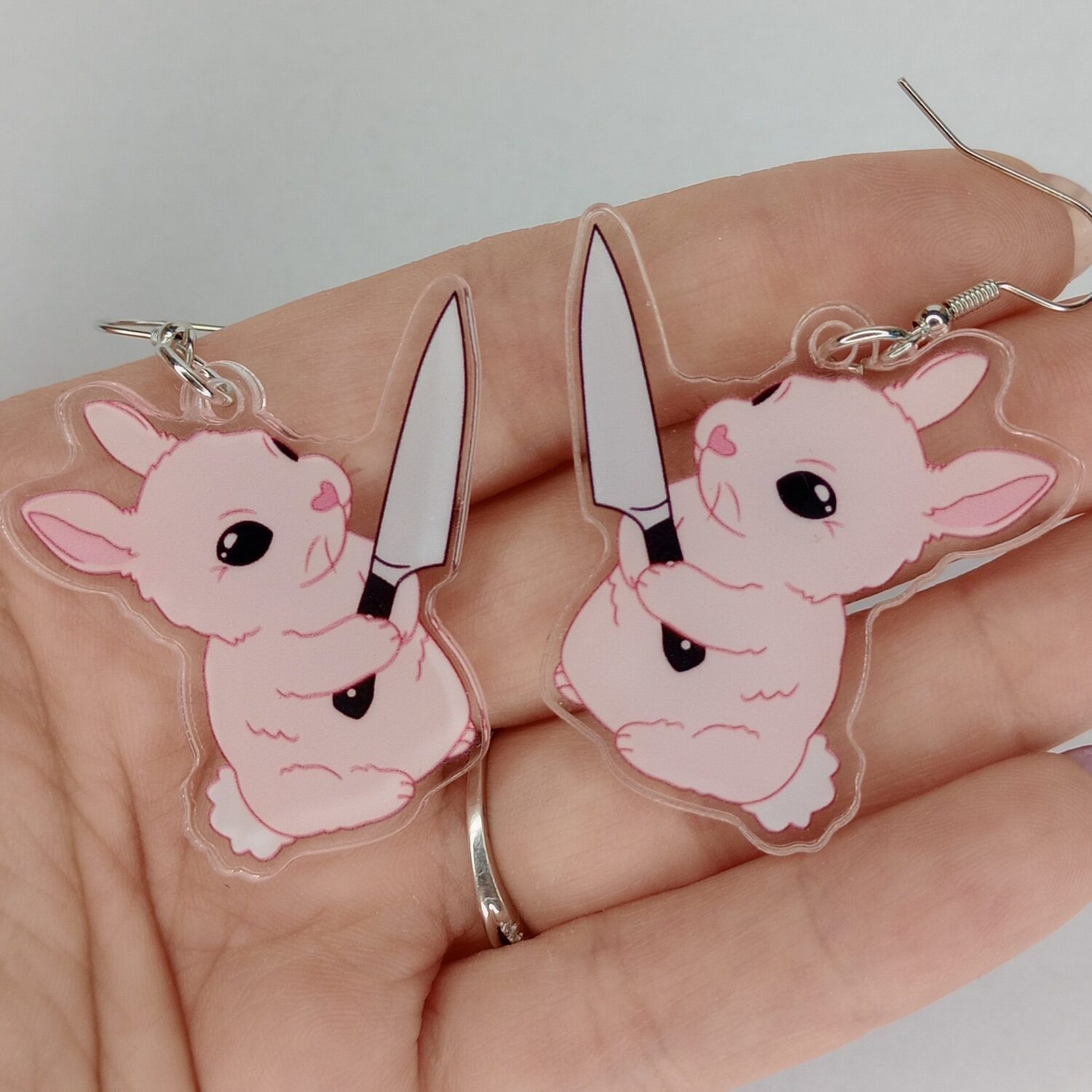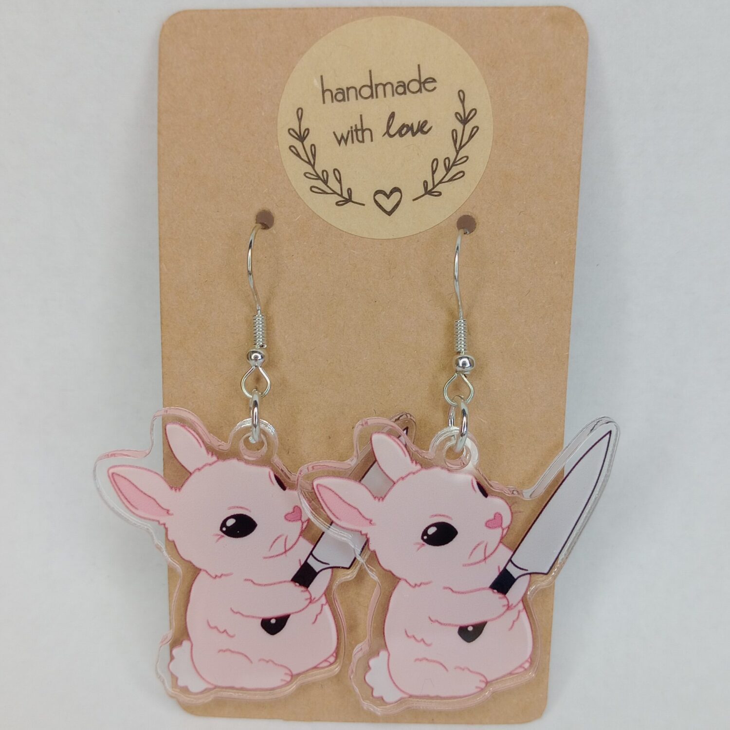 Introducing our striking Knife Bunny Earrings, where whimsy meets rebellion in a unique and captivating fashion statement. Crafted with meticulous detail, these earrings feature charming rabbit motifs with a daring twist – each rabbit proudly brandishing a tiny knife. The mix of innocence and edge creates a conversation piece that is both intriguing and thought-provoking.