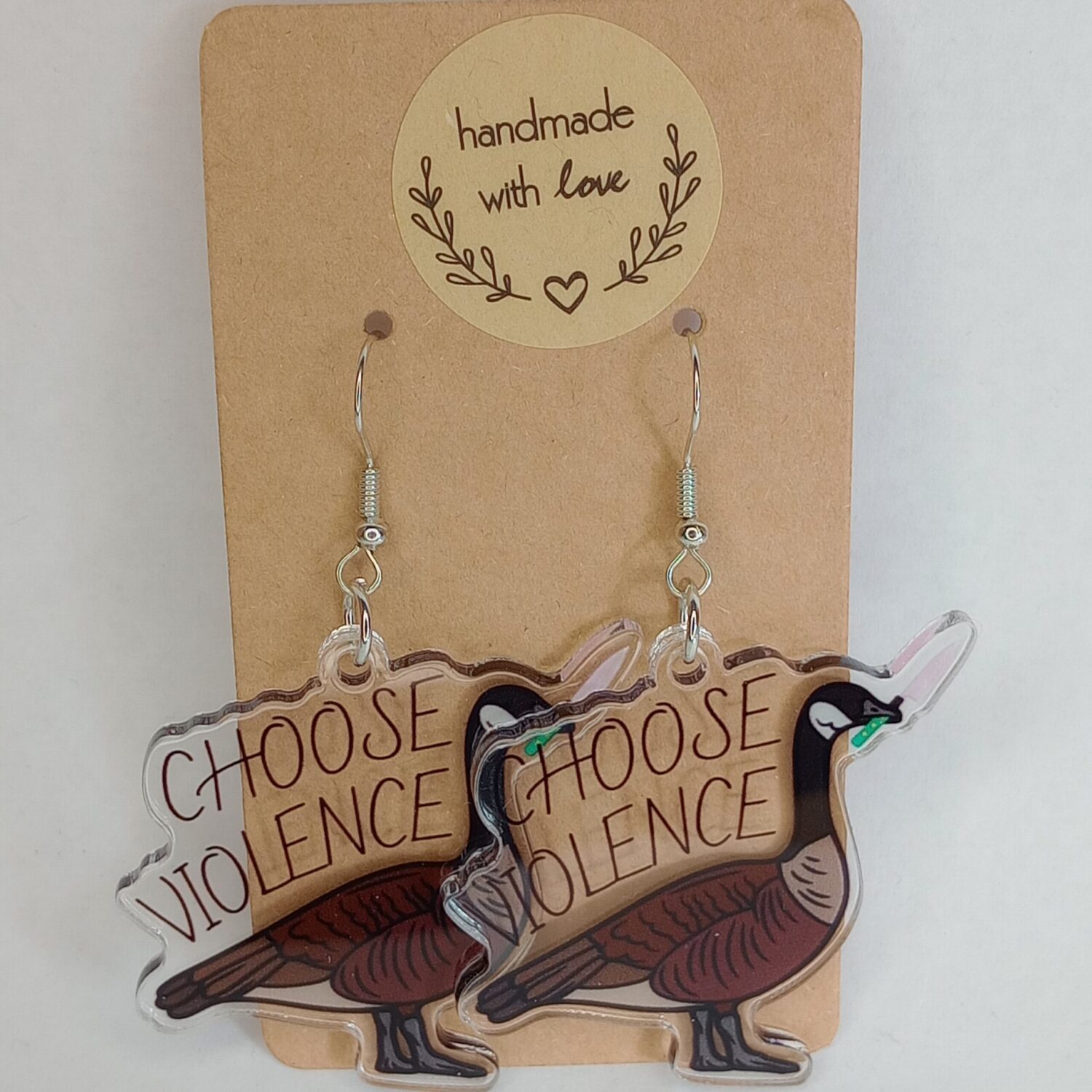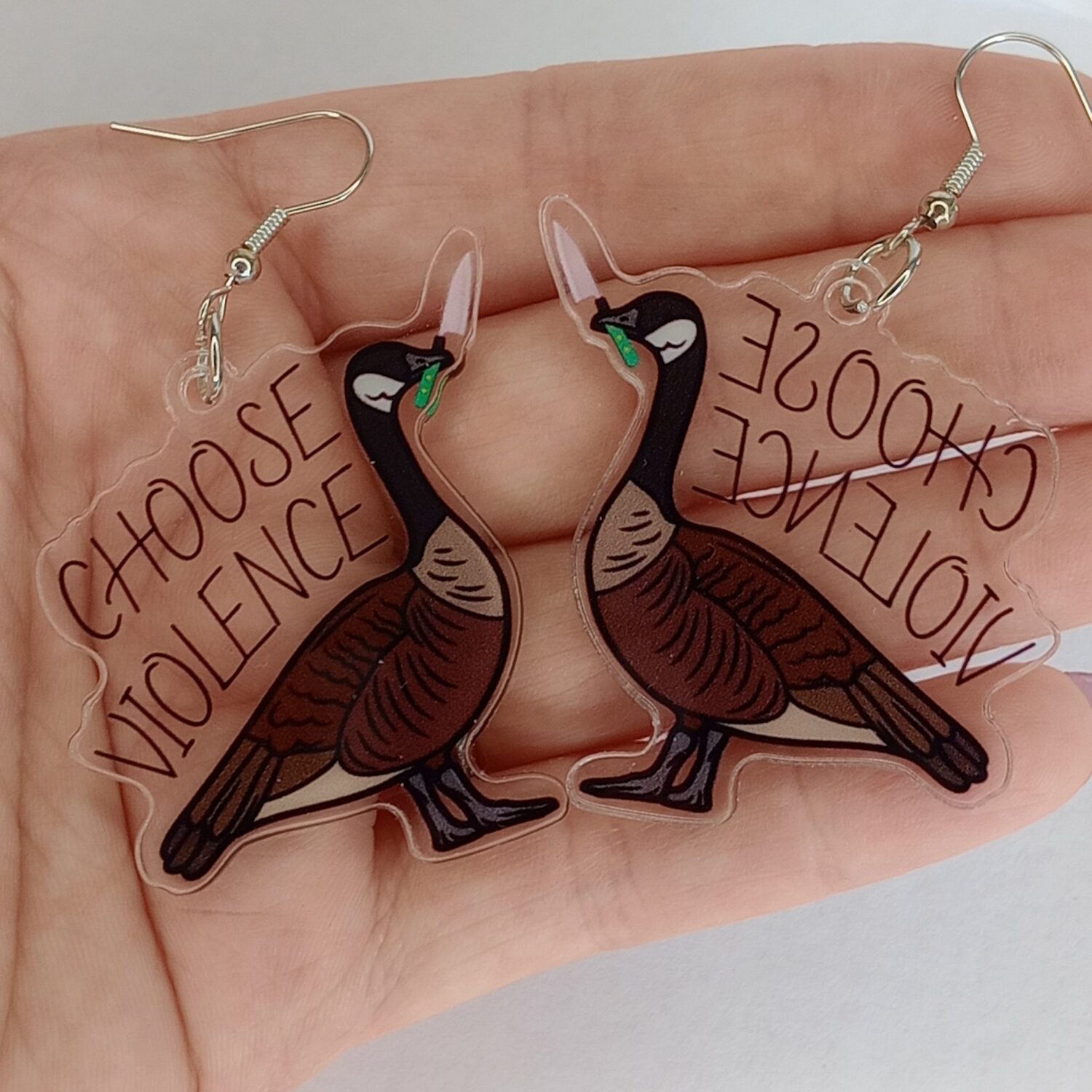 Introducing our striking Knife Goose Earrings, where whimsy meets rebellion in a unique and captivating fashion statement. Crafted with meticulous detail, these earrings feature charming goose motifs with a daring twist, each proudly brandishing a tiny knife and stating “Choose Violence.” The mix of innocence and edge creates an intriguing and thought-provoking conversation piece.