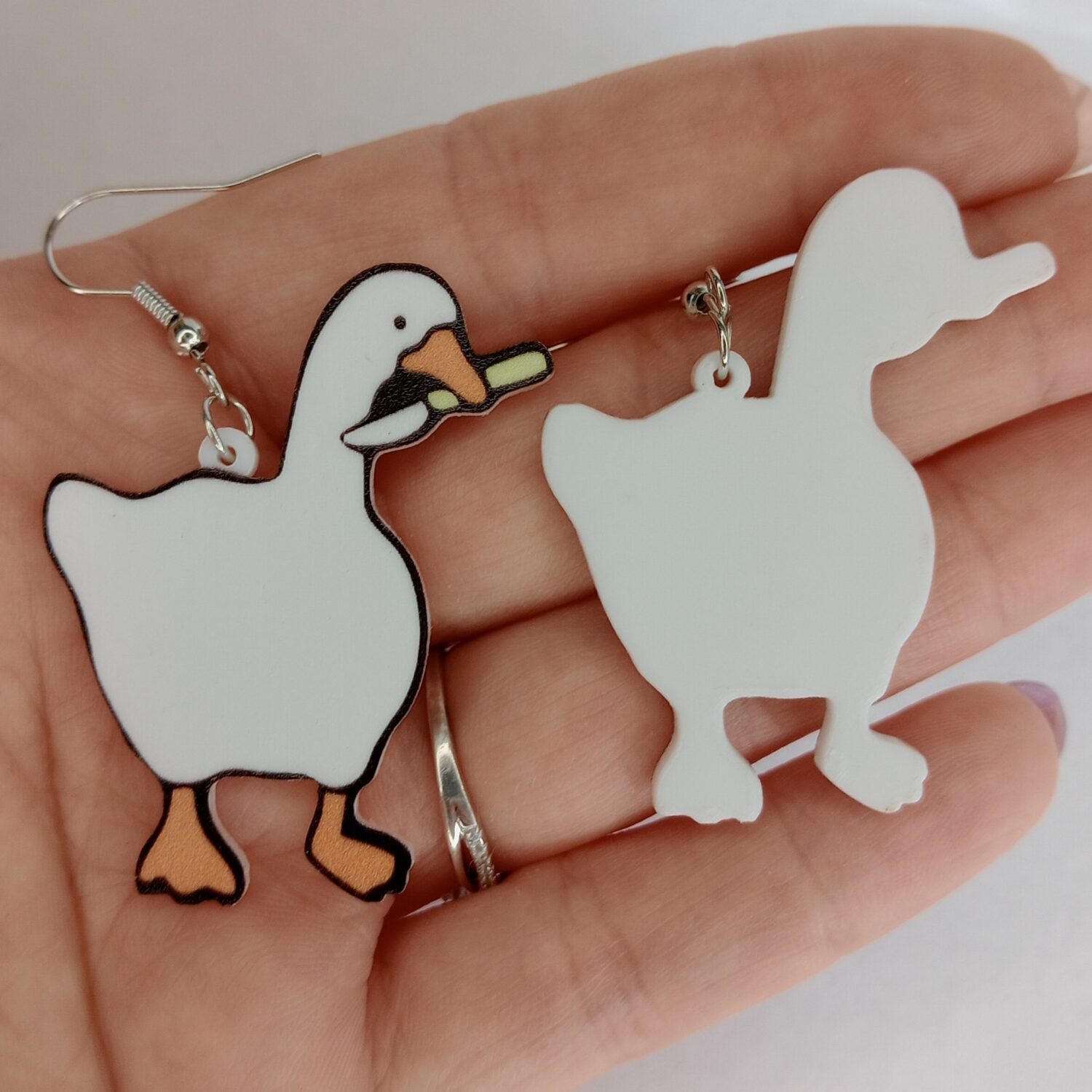 Introducing our striking Knife Goose Earrings, where whimsy meets rebellion in a unique and captivating fashion statement. Crafted with meticulous detail, these earrings feature charming goose motifs with a daring twist, each proudly brandishing a tiny knife. The mix of innocence and edge creates an intriguing and thought-provoking conversation piece.