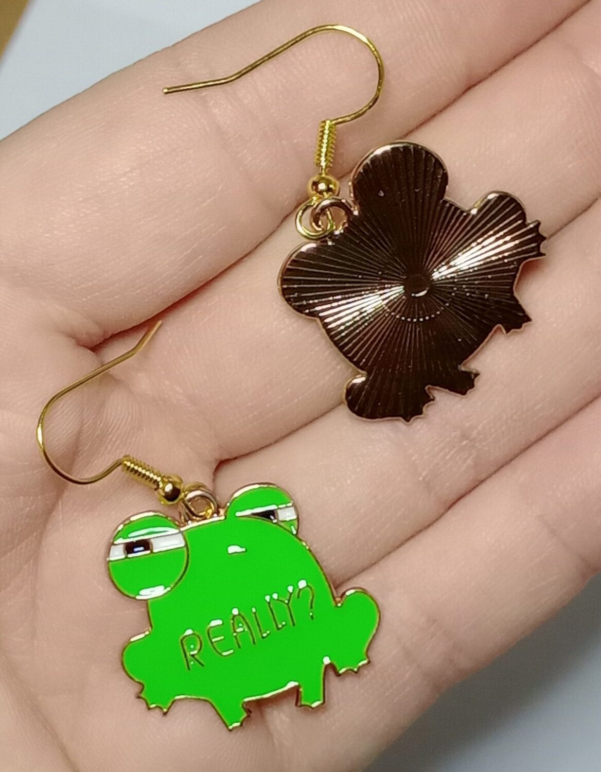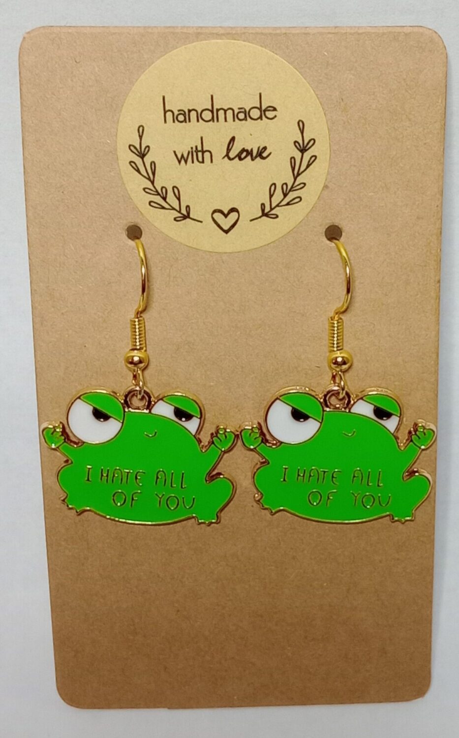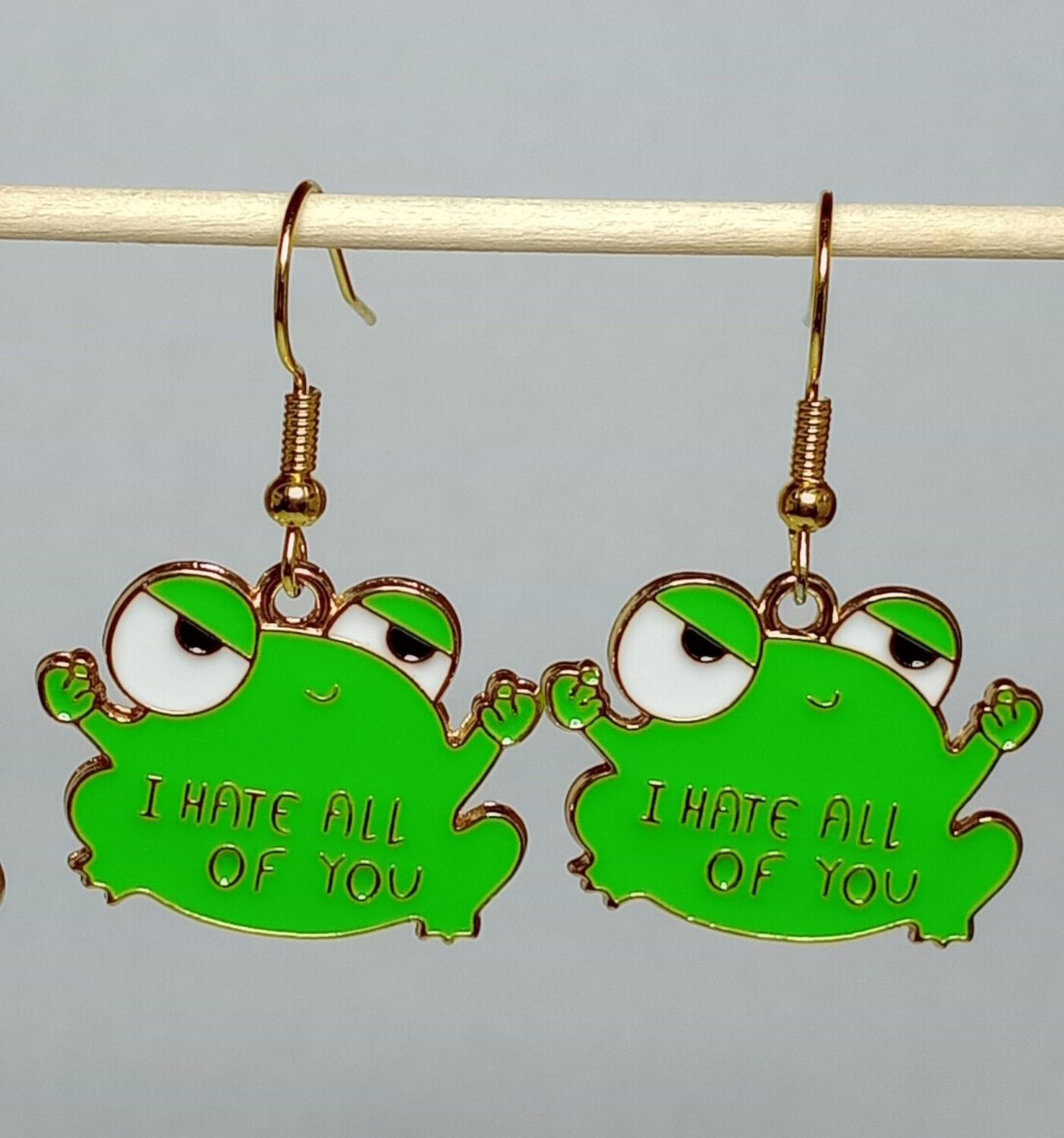 On the flip side, the second earring showcases a rebellious frog displaying a miniature middle finger, boldly declaring, “I hate all of you.” This rebellious amphibian is perfect for those moments when you want to make a statement and let your earrings do the talking.