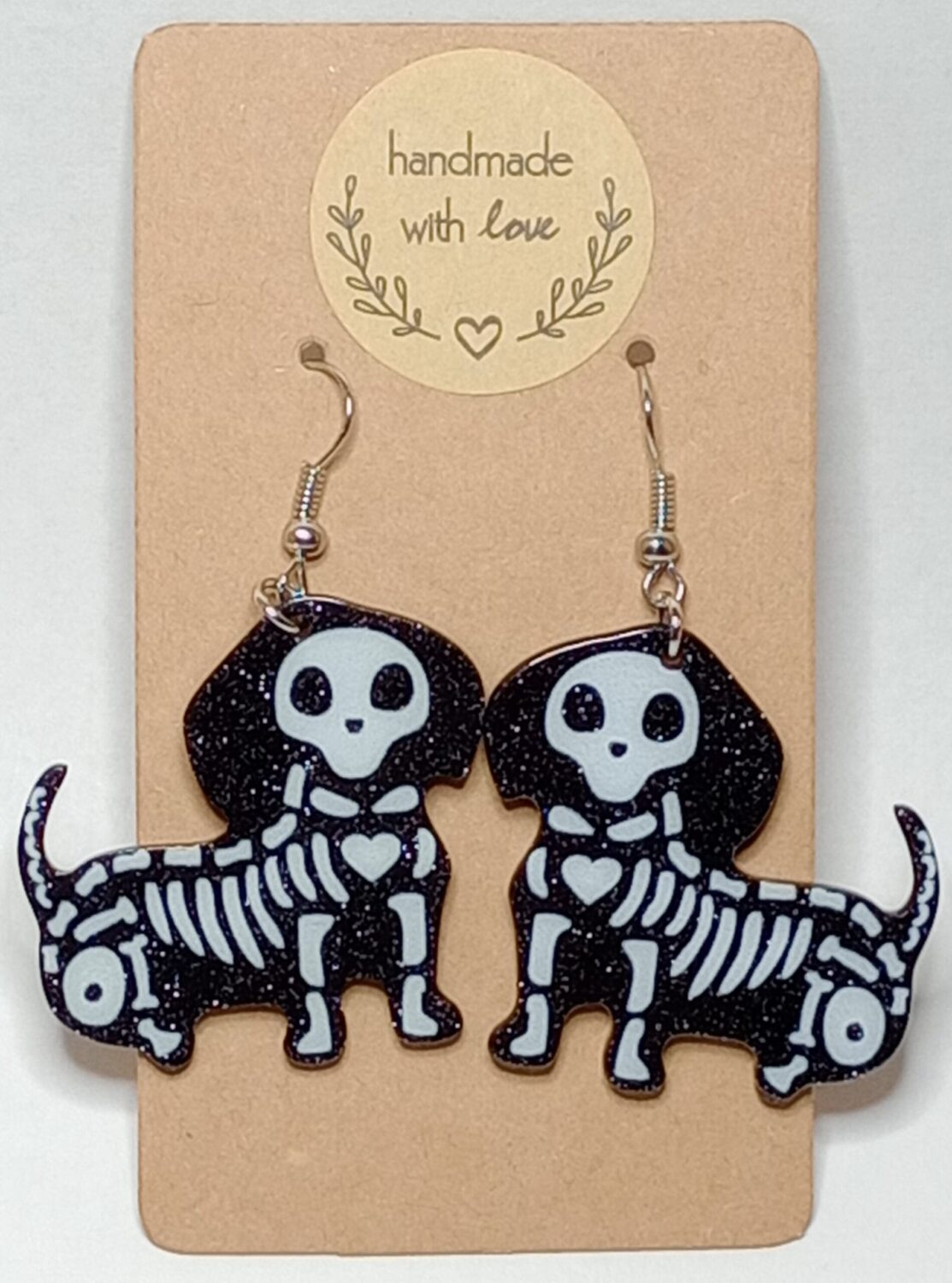 Add a playful and spook-tacular touch to your Halloween ensemble with our Skeleton Dachshund Earrings, featuring a black sparkle base and whimsical white bone details for a unique and charming accessory.