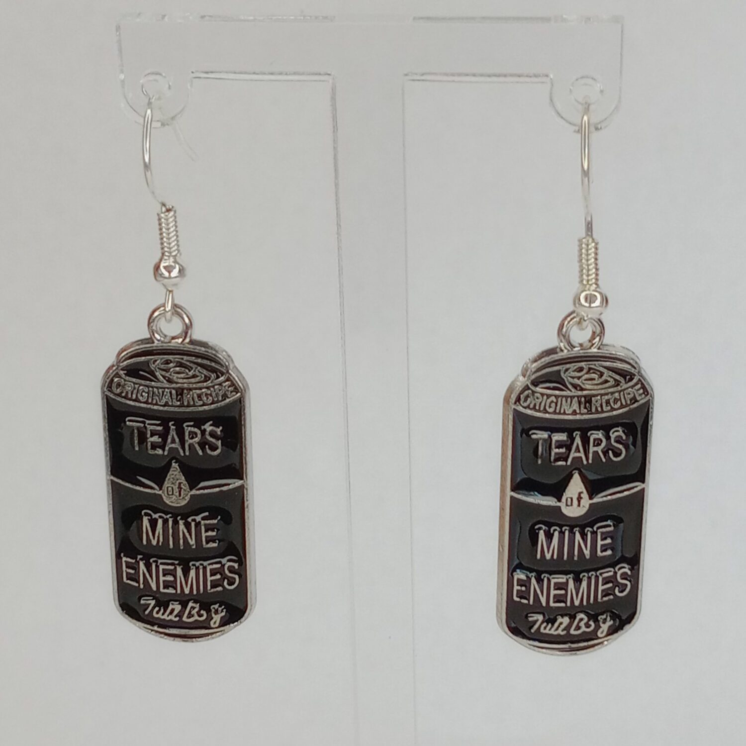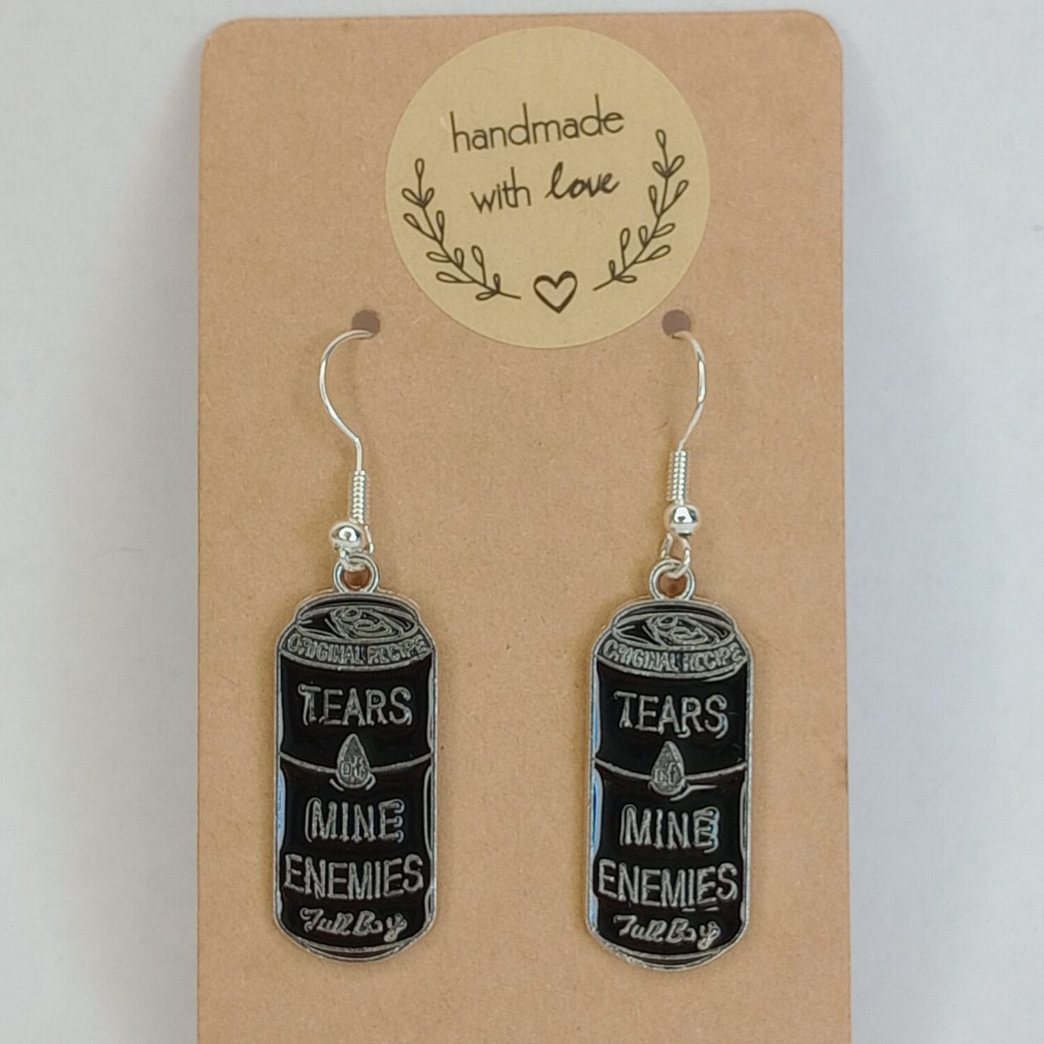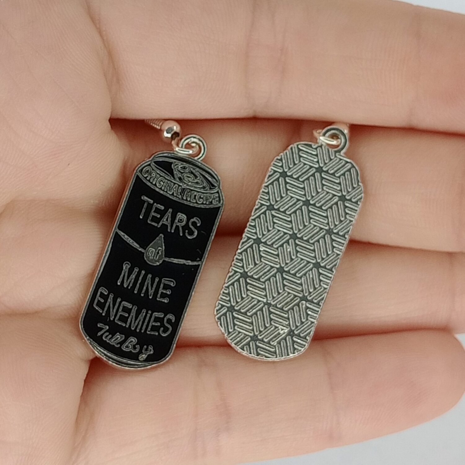 Each earring features a miniature soda can design, capturing the essence of rebellion and self-expression. The matte black finish exudes a mysterious allure, while the attention-grabbing phrase “Tears Of Mine Enemies” boldly graces the front of each can, adding a touch of attitude and defiance.