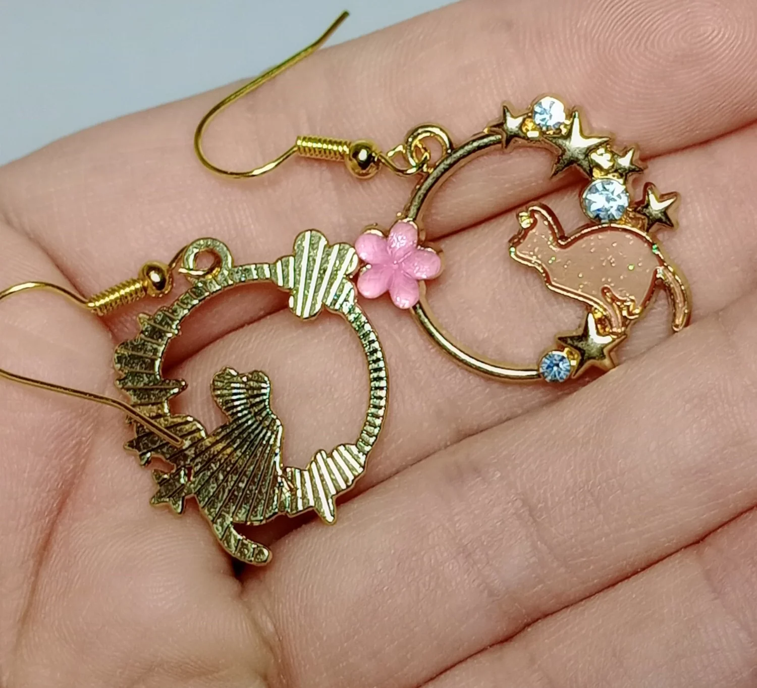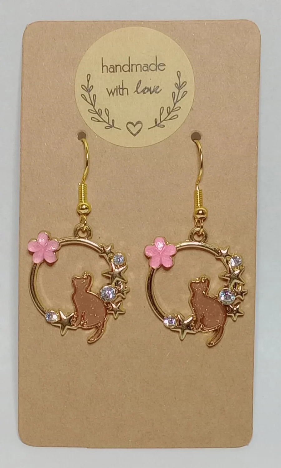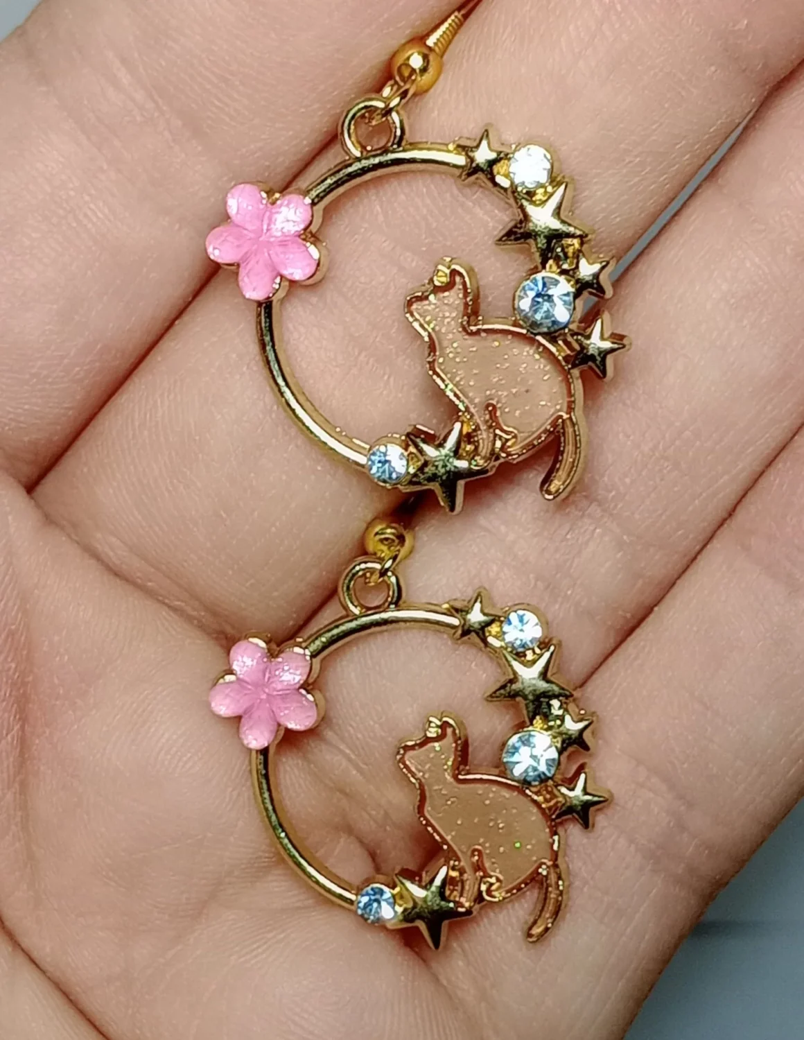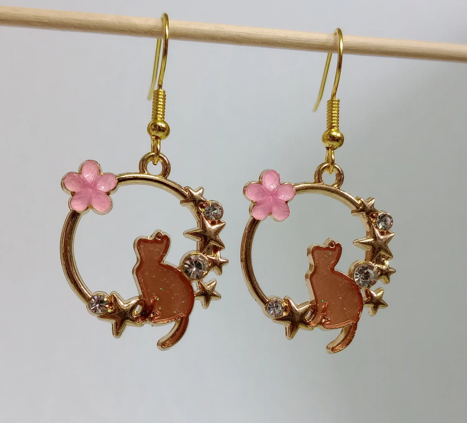 Introducing our Whimsical Cat Halo Earrings – a captivating fusion of elegance and whimsy. These enchanting earrings feature a delicate gold ring with a poised cat sitting inside, its gaze directed upward toward a vibrant pink flower adorned with sparkling gems. Immerse yourself in the charm of these uniquely crafted earrings, where feline grace meets floral allure, creating a sophisticated accessory that effortlessly elevates your style.